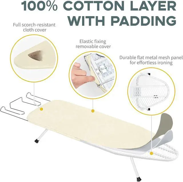 Effortless ironing: Open with completely flat and seamless cushioned surface. The metal mesh panel with a heat-resistant 100% cotton cover and pad helps to dissipate heat more quickly