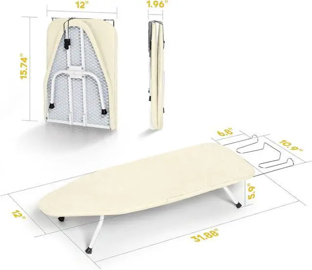 Small Iron Board: RAINHOL counter top ironing board measures 32 x 12 x 6 when expanded and 15 x 12 x 2 when folded. Also, iron holder is included in the set