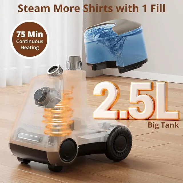 2.5L Large Tank for 75-Minute Continuous UseDon' t let frequent refills interrupt your workflow. The extra-large 2.5L water tank allows for up to 75 minutes of non-stop steamingenough to refresh your entire wardrobe or multiple garments in a single session. Spend less time refilling and more time steaming.