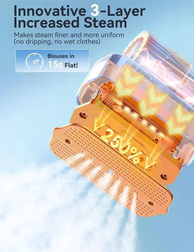 Product InnovationThe innovative 3-layer casting panel design makes the steam more delicate and uniform, significantly improving the ironing effect while extending the use time of the water tank. It can effectively remove folds and wrinkles and is safe for a variety of fabrics like cotton, linen, silk, fiber, wool, polyester, etc.