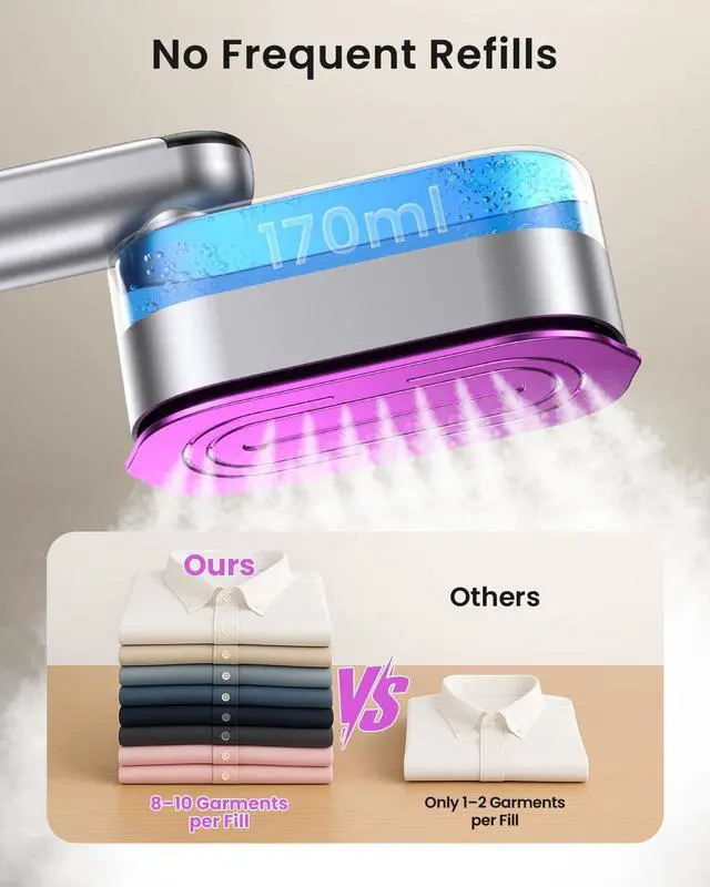 Safe & Reliable Operation: Used for worry-free operation, this portable steamer for clothes is designed with overheating and overload protection. Capable of self-cleaning to prevent scale buildup, it causes longer lifespan and safer performance for regular use.