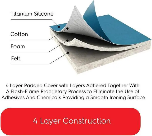 Durable: Heavy duty ironing board cover with extra thick 4 layer padding - Titanium, silicone, inner foam layer and felt under padding. Cover is scorch, water and stain resistant for long lasting use