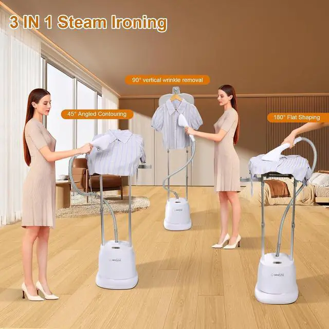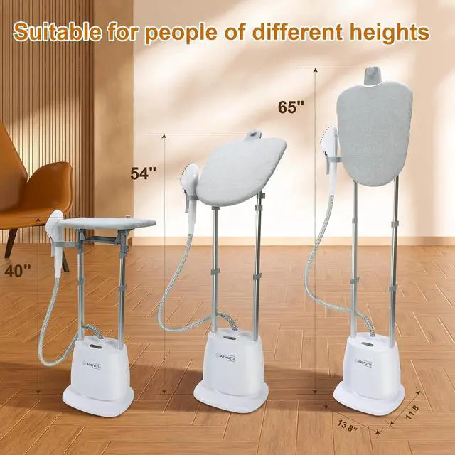 Adjustable Height and Angel: The garment steamer has two telescopic rods, you can adjust the height to suit different heights. In addition, the rotatable ironing board enables ironing from three angles - 90° vertical wrinkle removal, 180° flat ironing molding, and 45° angled contouring. Tackle hanging clothes, tabletop ironing, and intricate garment shaping with one ARSFUTU professional steamer.