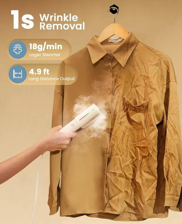 POWERFUL WRINKLE REMOVAL &15 FAST-HEAT: The steamer uses high pressure steam at 248°F 18g/min to easily soften and remove wrinkles from folded, washed, and dried garments in less than 1 second. With 1, 000W of power, it delivers a steady steam output that avoids water spray and refreshes your clothes in minutes. 15s to reach the working problem, no need to wait and save time.