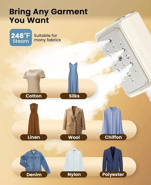 2 In 1 STEAMER IRON FOR CLOTHES: Garment Steamer 248°F high temperature steam combined with a high mist volume of 0.78 ounces per minute quickly removes creases, flattens and cleans clothes. The 302°F dry ironing panel can be used for removing creases, and can also be used to shape collars and pant legs. Suitable for removing creases including silk, lace, organza, cotton, linen, nylon, denim, wool and other fabrics. Protect your garments with the appropriate wrinkle release mode.