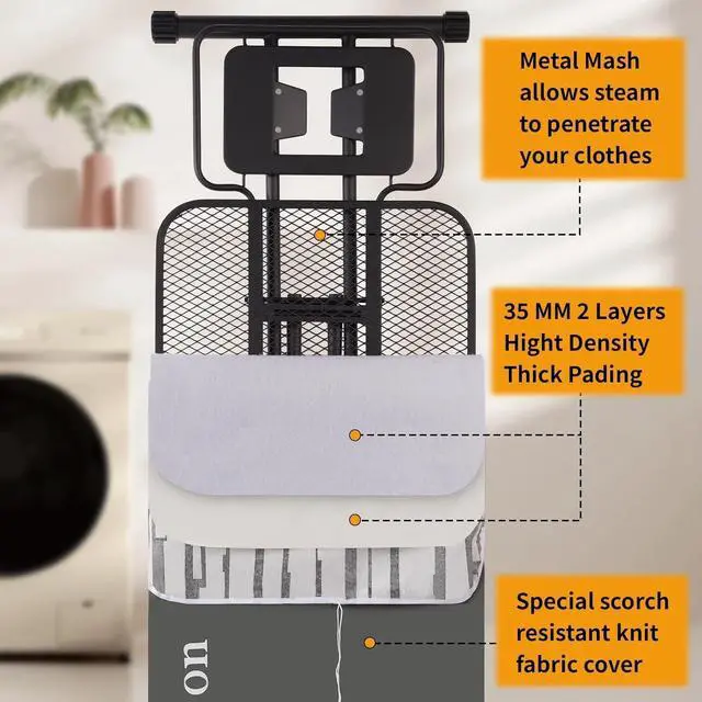 • Biggest Ironing Board on Market - Our extra-wide ironing board stands as one of the widest available on the market today. Its expansive design allows you to effortlessly iron larger sections of fabric in a single stroke, resulting in reduced shuffling and considerable time saved during your ironing chores.