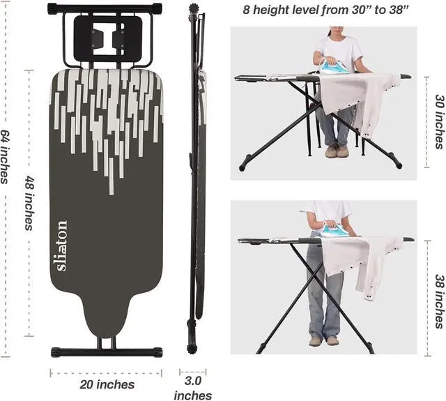 Adjustable Height - This ironing board offers multiple height adjustments ranging from 30" to 36". Whether you prefer standing or sitting while ironing, or sharing it with someone of different heights, It' s the ideal choice for both men and women.