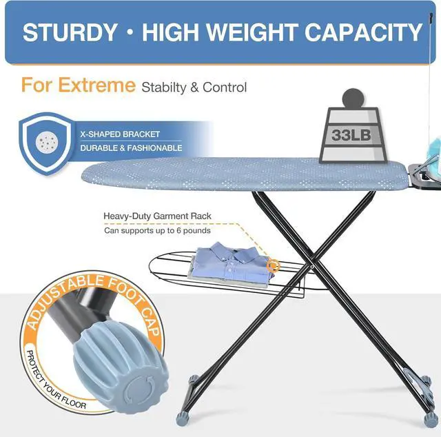 Plenty Of Storage Space - The APEXCHASER ironing board has a garment rack at the bottom for storing clothes, and the ironing rest also comes with a clothes hanger for clothes you don' t want to crease. The ironing rest supports up to 8 pound and the ironing board can hold up to 33 pound, making ironing a breeze.