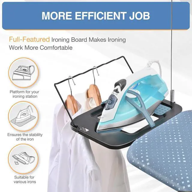 Easy storage and stability - The APEXCHASER ironing board is designed for convenience and ease of storage, featuring a hook for wall-mounted stowage. Anti-skid feet ensure stability and prevent the iron from wobbling during use.