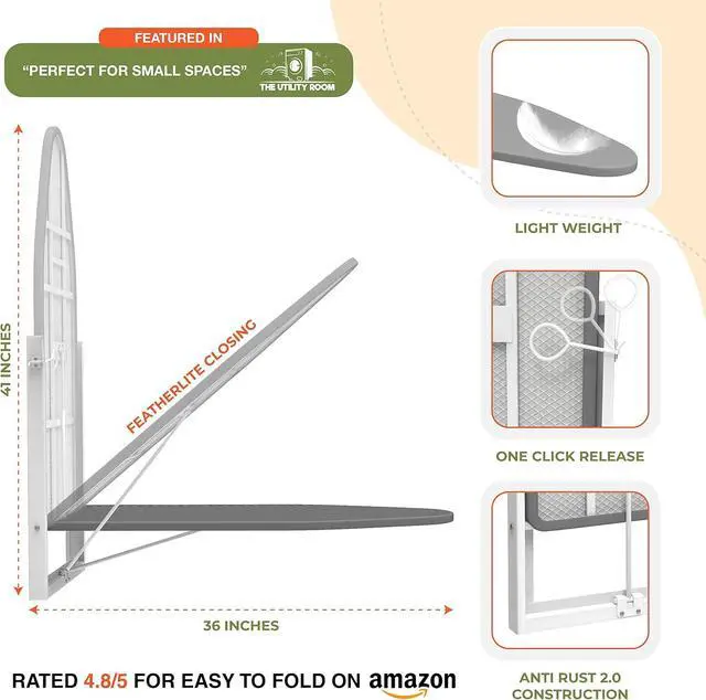 EASY INSTALLATION (4 BOLTS): The folding ironing station can be easily installed with just 4 bolts (included) fixing the holder together with the wall or in a cabinet. It is structurally rigid with one click release hinges and does not take more that 20 minutes to install.