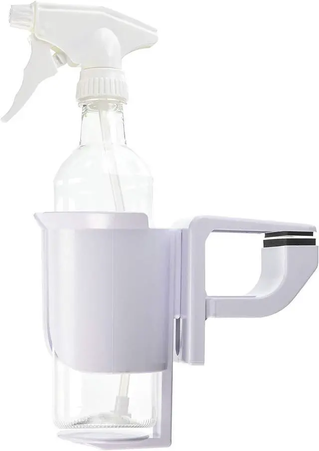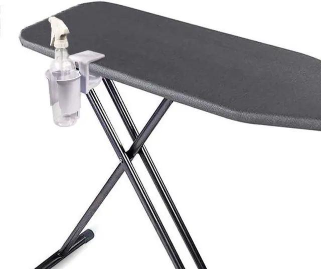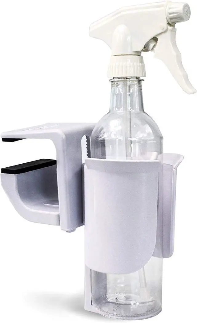 A 10.6 ounce misting spray bottle and holder that simply clamps and holds securely to your ironing board