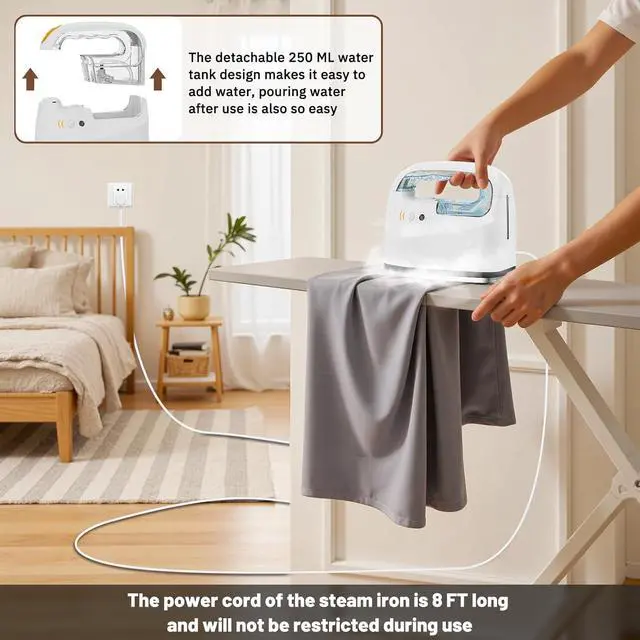 Comfortable Design: The Portable Steamer Iron for Clothes has 250ML detachable water tank. 8-foot long power cord, Ergonomic Comfort Handle, gift a heat-resistant panel cover and storage pouch and a protective gloves.