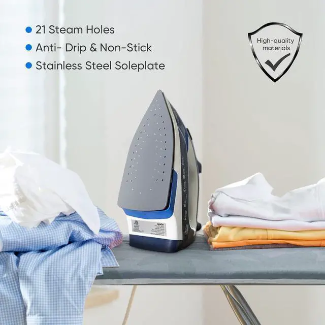 EASY IRONING: This clothes iron equips 21 steam holes which can provide even and fine steam to quickly remove wrinkles of clothes, and the vertical steam function is not only suitable for horizontal ironing, but also for ironing the hanging clothes vertically.