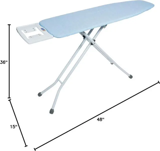 EXTRA WIDE IRON PLATFORM - The mesh top ironing surface offers 15 x 48 inches. The built-in steam iron rest ensures you keep hot iron in place until cooling