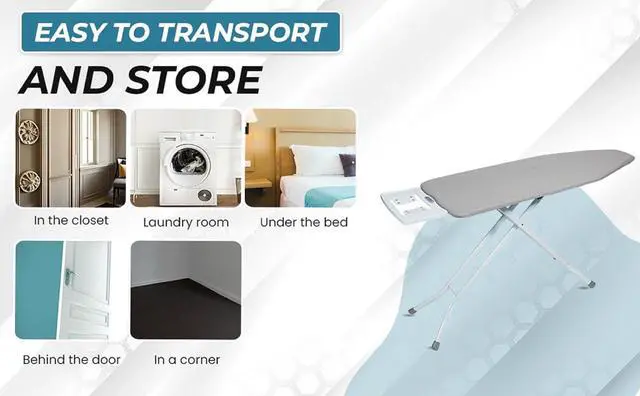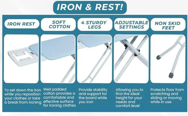 AUTOMATIC HEIGHT ADJUSTMENT - Set up the right height to comfortably iron your clothing pieces. It adjusts from 29-inch to 36-inch