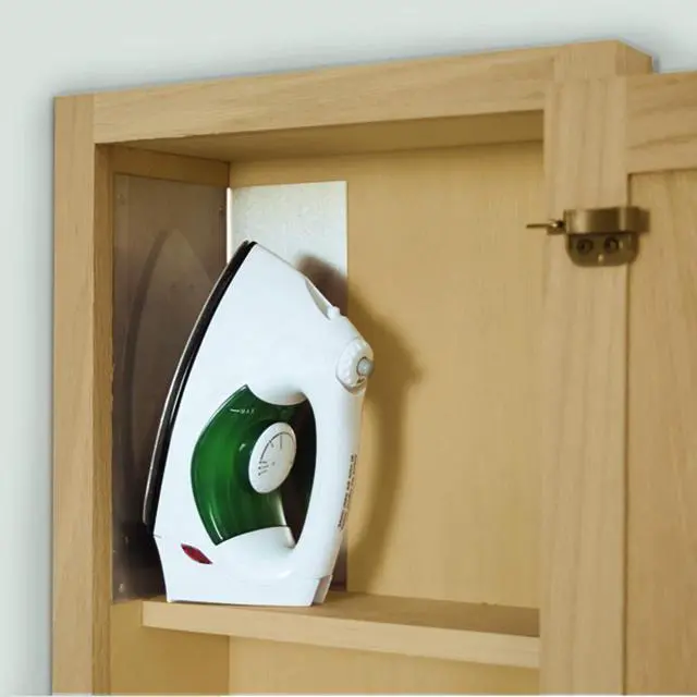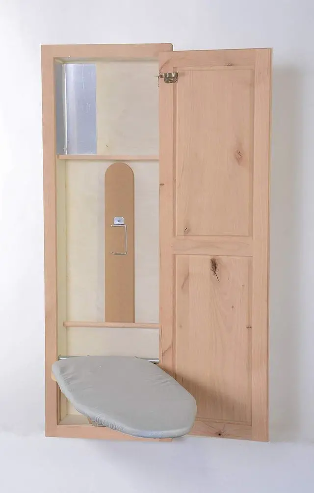 RECESSED IN WALL (CUT A HOLE IN THE WALL) WITH A 180 DEGREE SWIVEL COMES WITH IRONING BOARD COVER AND PAD SET ALL WOOD, COMES WITH SLEEVE BOARD, MADE IN THE USA RAISED PANEL DOOR, SHELF, AND HEAT SHIELD 47 3/4" L x 16" W x 7" D