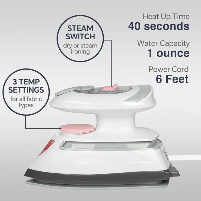 Fabric Select: 3 temperature settings provide the perfect heat for various fabrics like linen, cotton, silk, and wool; Switch between dry and steam ironing with a simple flip of the steam switch
