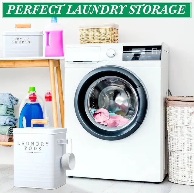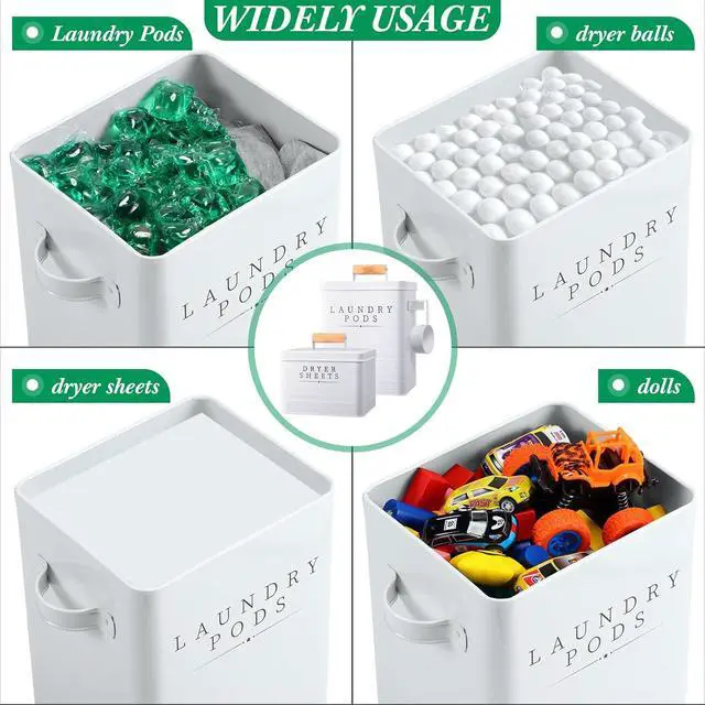 Versatility Usage: these laundry containers for organizing are flexible for various laundry needs; From holding laundry pods to containing dry balls, cotton wool, laundry scent boosters, and washing powder (except for liquid detergent), you' ll find multiple uses; Their adaptability makes them a valuable asset to most laundry rooms