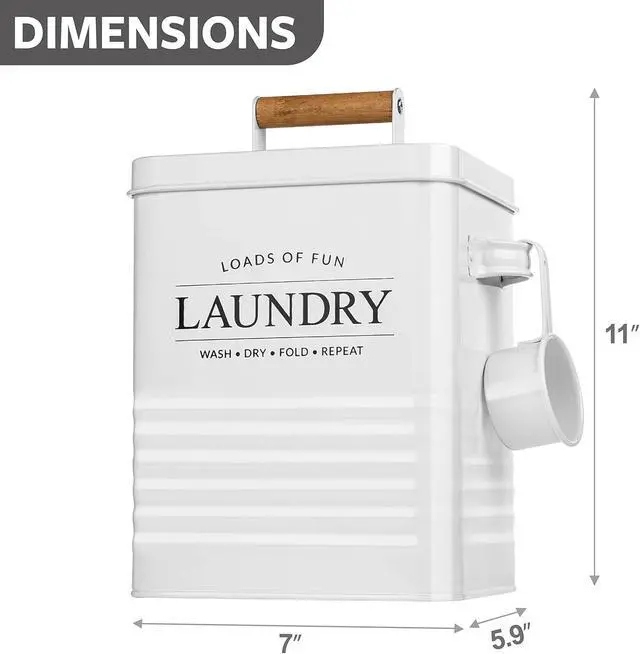 HIGH QUALITY: If you need a laundry storage box that will hold up under any conditions, look no further. This storage box is made of sturdy tin metal and spacious enough with 7 (L) X 5.9 (W) X9 (H) inch size dimensions. It also features two side handles so you can easily transport it to anywhere and a wooden handle lid to keep your laundry essentials clean and dry. Scoop is also included and it has a hooked top so you can hang it over the two side handles of a storage box