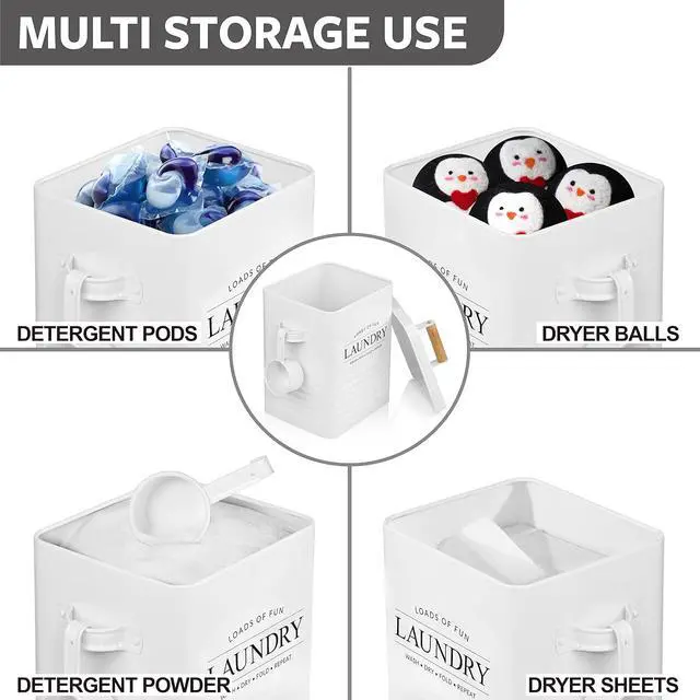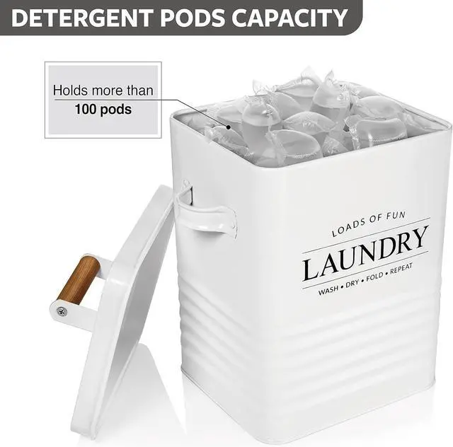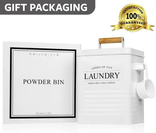 MODERN FARMHOUSE DESIGN: Modern product design with a word laundry is printed on a farmhouse style laundry powder container with a wooden handle providing modern farmhouse touch to your laundry room. This laundry storage tins white color will blend seamlessly with any laundry interior scheme and is a wonderful alternative to cardboard laundry detergent boxes