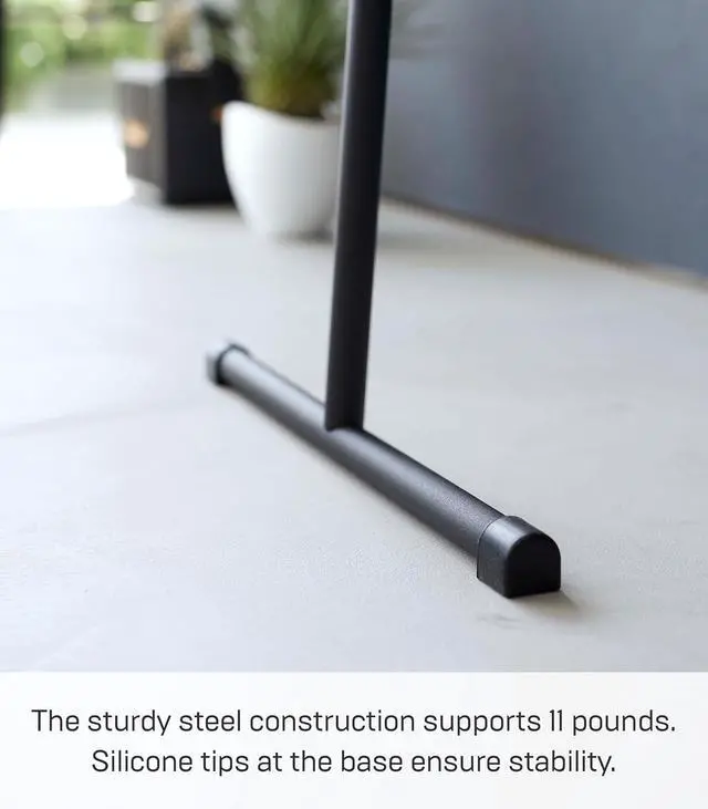 [Made of steel with an attractive wooden dowel] The sturdy steel construction supports 11 lbs. Silicon tips at the base ensure stability.