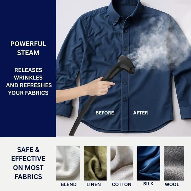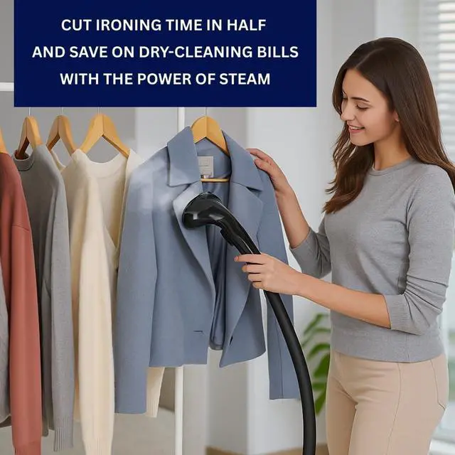 POWERFUL 1500W PERFORMANCE Delivers strong, continuous steam to smooth wrinkles from clothes, curtains, and fabrics a reliable garment steamer for clothes with stand for everyday use.