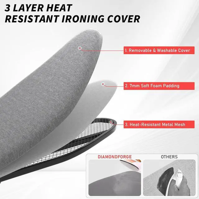 Efficient Ironing: DIAMONDFORGE full-size ironing board features a 3-layer cover and padboasting heat resistance and fast steam penetration. Its 43×13-inch extra-wide, extended surface delivers ample workspace for effortless ironing