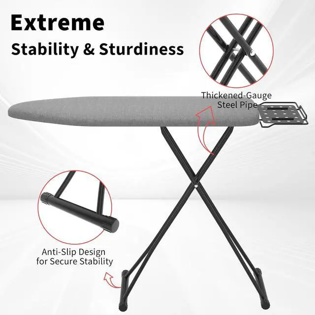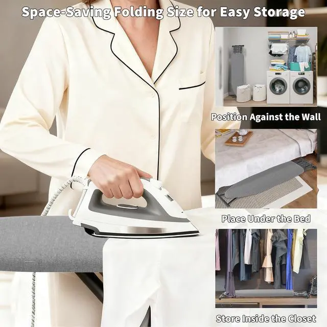 Sturdy & Stable Build: Heavy-duty ironing board with reinforced anti-shake steel feet and non-slip rubber sleevelocks in place to stay shake-free and slip-resistant, while protecting your floors. Weighing 10lbs, compact folding design saves maximum space for easy storage and hassle-free transport(fits closets, laundry rooms, or small apartments)