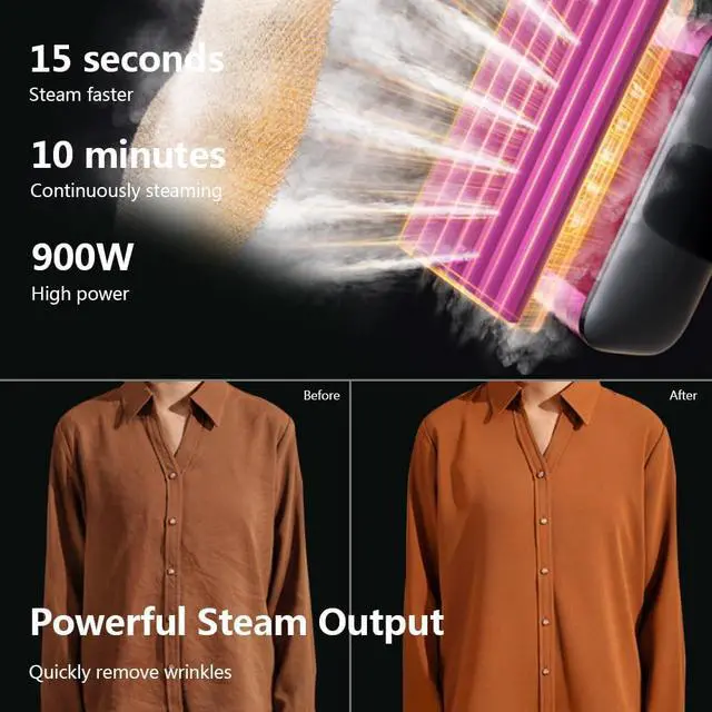 EASE TO USE: 900W Steamer produces soft and long-lasting dry steam. preparation for steaming in just 15 seconds, with only one button to control for steaming. 6ft Power Cord, easy for operating steamer conveniently. Equipped with wall mount bracket and A travel storage bag, it can be a portable travel steamer or a handyhome steamer.