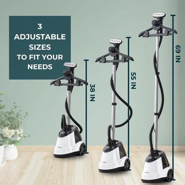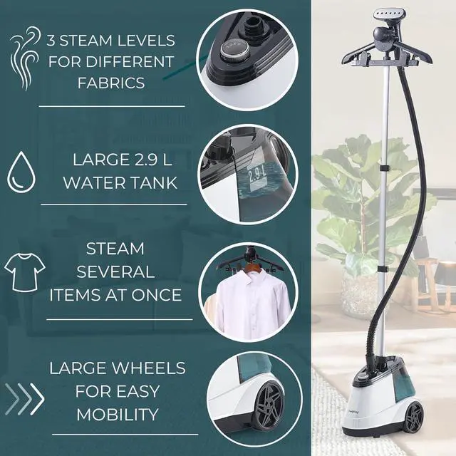 POWERFUL COMMERICAL GRADE PERFORMANCE Built with an 1800W boiler system, this steamer efficiently tackles wrinkles on clothing, drapes, furniture, and more - perfect for businesses or large families.