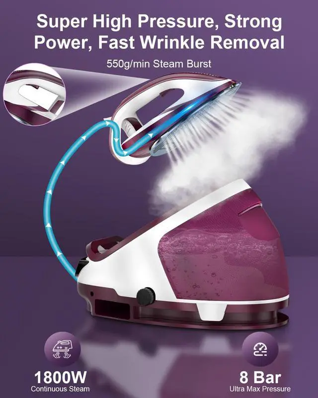 Use & Fast Wrinkle Removal: The steam station operates a professional boiler that generates up to 8 bar high pressure that releases 550g/min steam burst, which ensures deep penetration into fabrics and instant wrinkle removal after just a few glides
