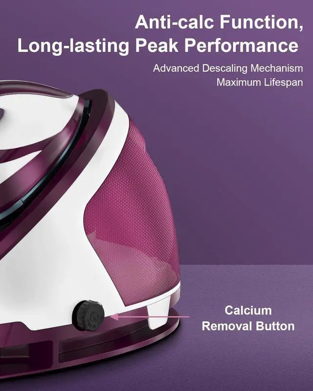 Anti-Drip: The steam generator will auto off after 10 minutes of inactivity to prevent accidents and fabric damage, while the anti-drip and anti-calc features prevent water drop and limescale build-up for long-lasting peak performance