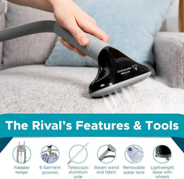 COMPACT DESIGN: The Rival standing steamer features a lightweight design with a folding rack and wheels for effortless portability. Its telescopic pole and compact dimensions (13 x 14 x 18) make storage simple and ideal for tight spaces.