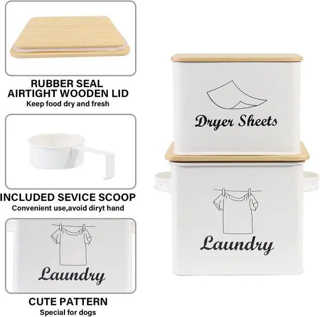 3. Washing Powder Storage - This metal tin set is clearly labelled with a LAUNDRY & DRYER SHEETS word in an attractive style font to identify the contents and save any mix-ups between your kitchen detergents.