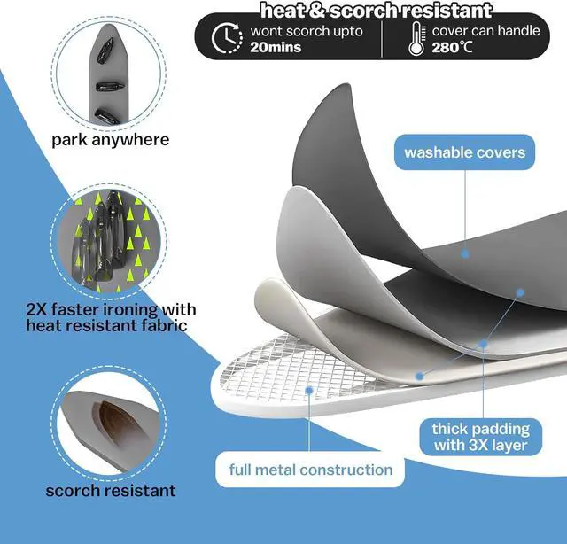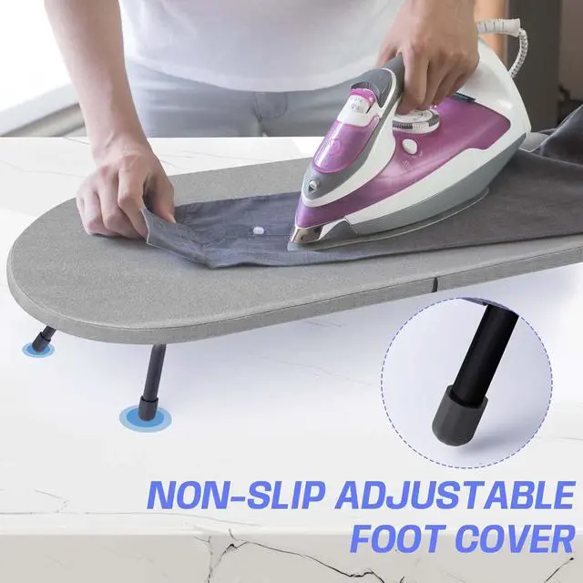 Smooth-Surface Metal MeshThe small ironing board with reinforced metal mesh ensures fast heat distribution for efficient ironing. Adjustable non-slip TRP feet protect floors and keep the board steady on uneven surfaces, while the breathable design prevents heat buildup.