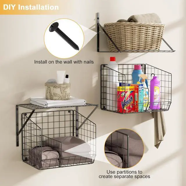High Quality Materials - This laundry shelves and baskets are made of high quality iron with exquisite paint plating to prevent corrosion and paint peeling. The iron shelve can bear 50 pounds of weight and the basket can bear 25 pounds of weight. Great for organizing heavy items on the wall.