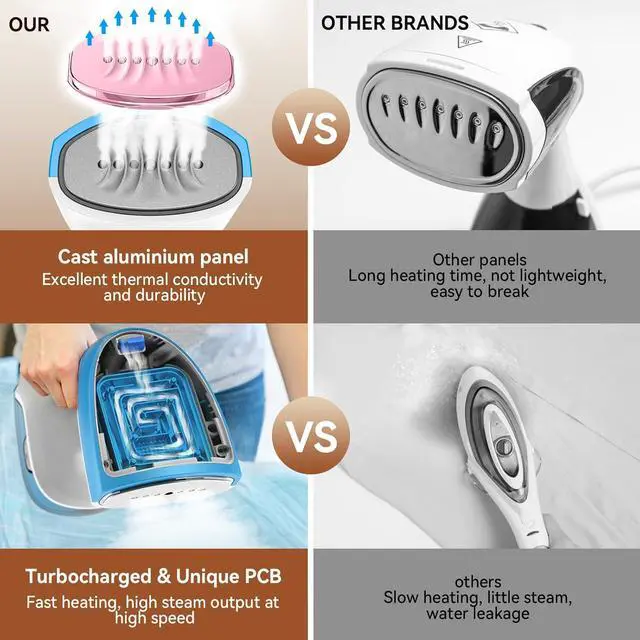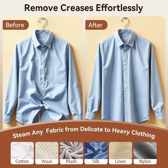 Steamer for clothes rate power: 1000W, 30s quick heat-up with 7 holes metal panel spraying strong steam 21g/min output continuously offers fast & efficient wrinkle removal, odor-eliminating and refreshing fabrics, ensuring your garments are impeccably smooth and presentable in no time.