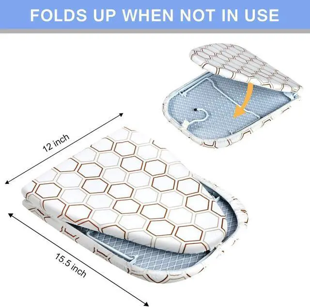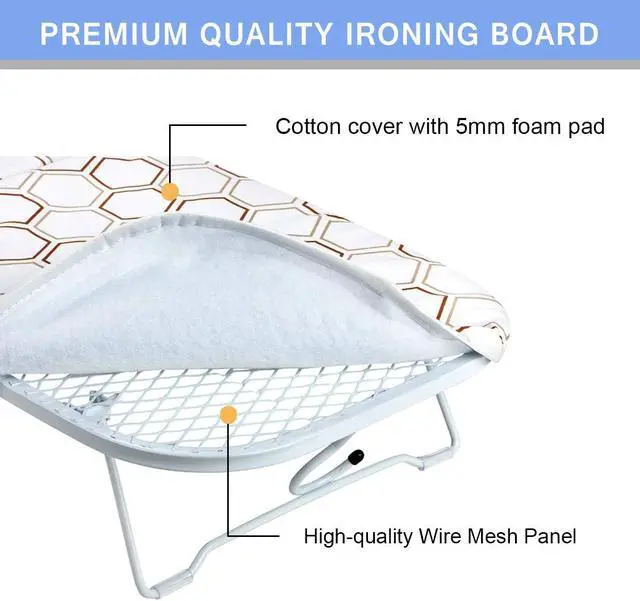 PERFECT IRONING EXPERIENCE-There are no complicated installation steps, and you can get a small ironing board in just a few seconds. When you open the ironing board, the cover is flat and smooth and you can easily iron clothes on it