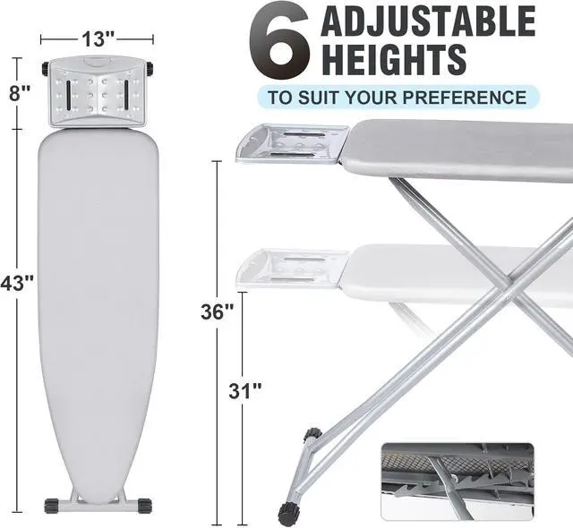 Heavy-duty Steel Frame & Large Surface - Engineered with a heavy-duty, rust-resistant steel frame for long-lasting stability. The large ironing board surface (43" x 13" ) easily handles everything from shirts to king-size bedsheets without constant repositioning