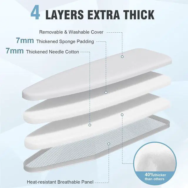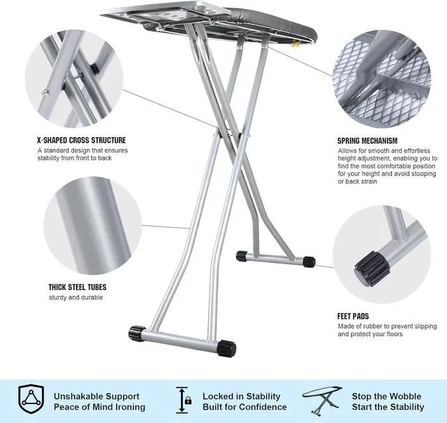 Sturdy & Wobble-Free Construction - Built with a reinforced " X" design base and ultra-grip rubber foot pads for exceptional stability. This ironing board stays firmly in place, giving you the confidence to iron without any shakes or slips