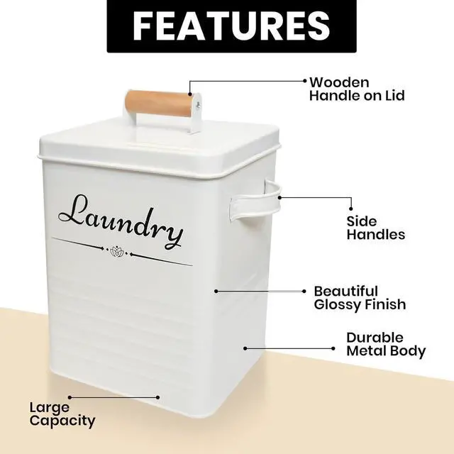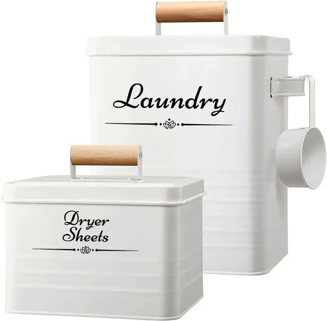 EASY TO USE Conveniently dispense powder with included metal scoop. Enjoy clutter-free, long-lasting storage solutions with Cruleens laundry detergent containers for powder. And replace your unsightly dryer sheet boxes with our practical and elegant laundry sheet holder.