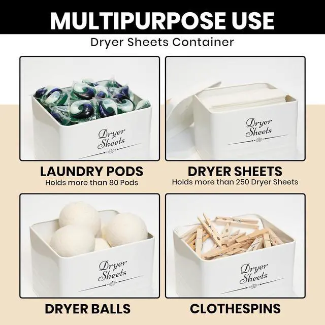 MULTIPURPOSE STORAGE Each Cruleen detergent container for the laundry room is highly versatile. You can easily swap out the powder for pods and the dryer sheets for clothespins. Or store dryer balls, scented beads, baking soda, and much more.