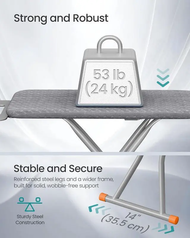 Stable and Built to Endure: Supported by robust steel X-legs with non-slip pads, this ironing board stays steady during use and holds up to 53 lb, while the iron rest supports 6.6 lb irons and 2.2 lb shirts