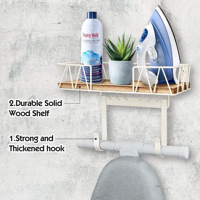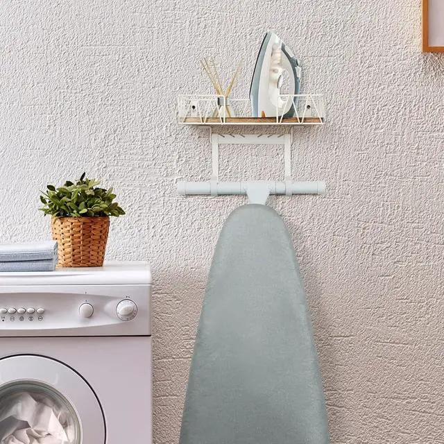 STURDY AND STYLISH: TJ. MOREE ironing board hanger includes a natural wooden element in its functional basket. While ensuring stored items are secure, it creates a rustic yet modern style.