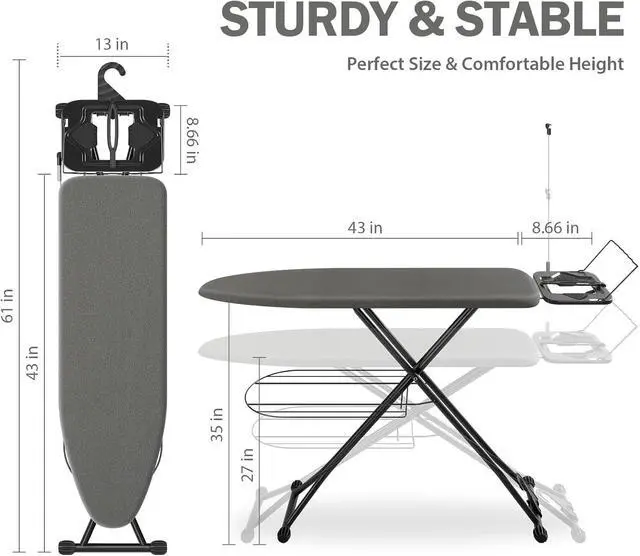 Portable Ironing Board: APEXCHASER iron board measures 13 X 43 inches with 7 height adjustments ranging from 27 inches to 35 inches to ensure a perfect fit for your height, and the safety latch design prevents accidental opening or closing