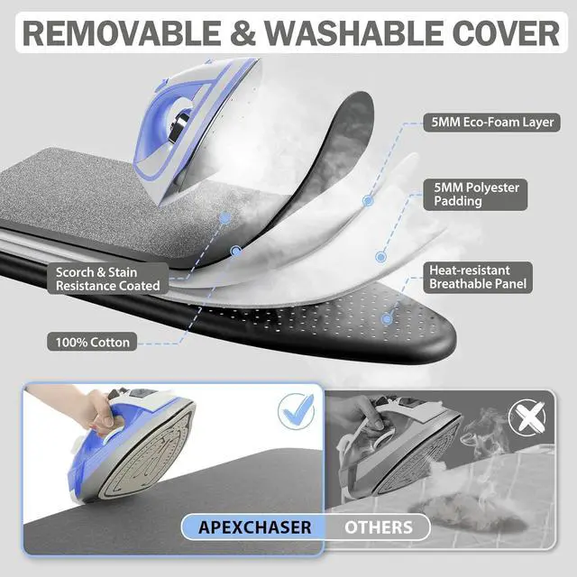 Easy storage and stability: The APEXCHASER ironing board is designed for convenience and ease of storage, featuring a hook for wall-mounted stowage. Adjustable feet ensure stability and prevent the iron from wobbling during use