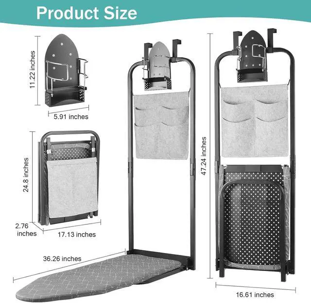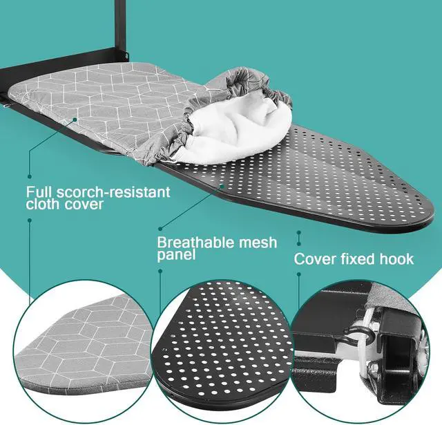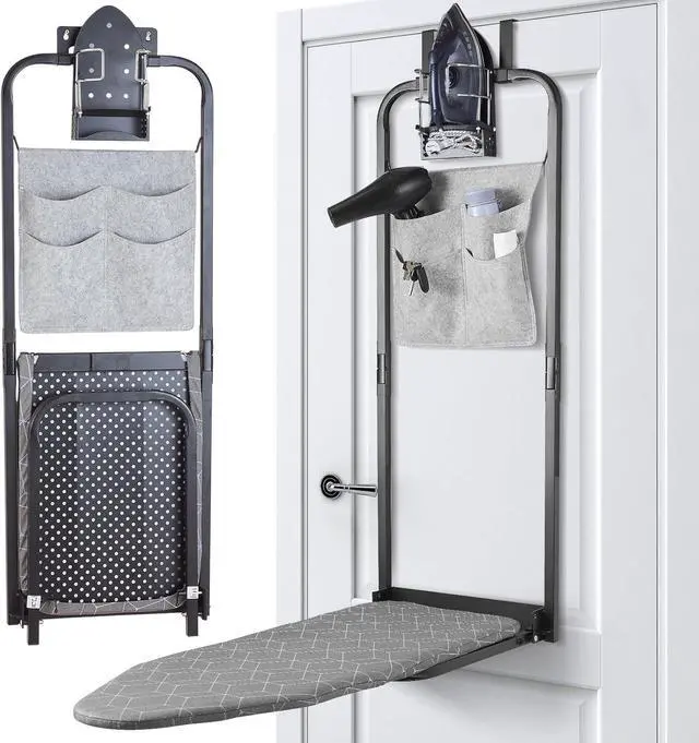 Integrated Iron Holder: Comes with a heat-resistant cradle keeps your iron upright and within reach. This hanging ironing board' s safety-first design prevents accidental burns and surface damage to doors