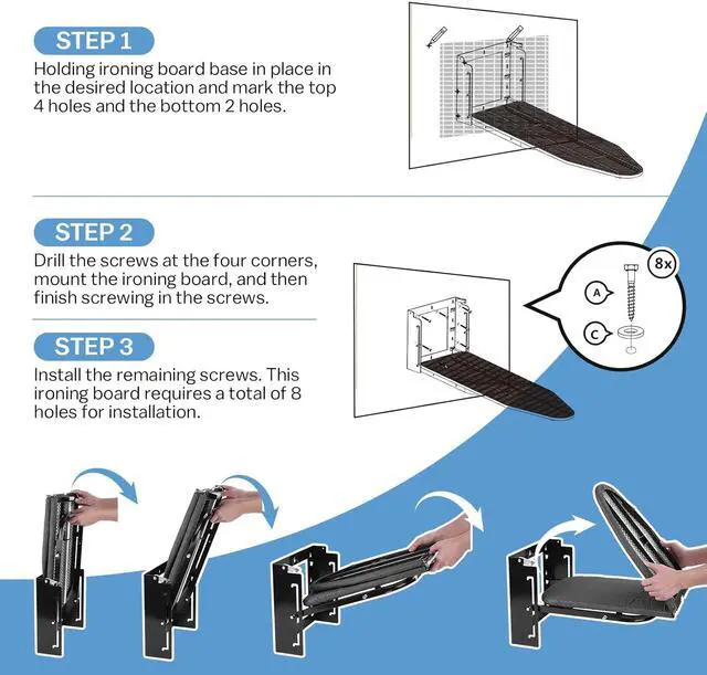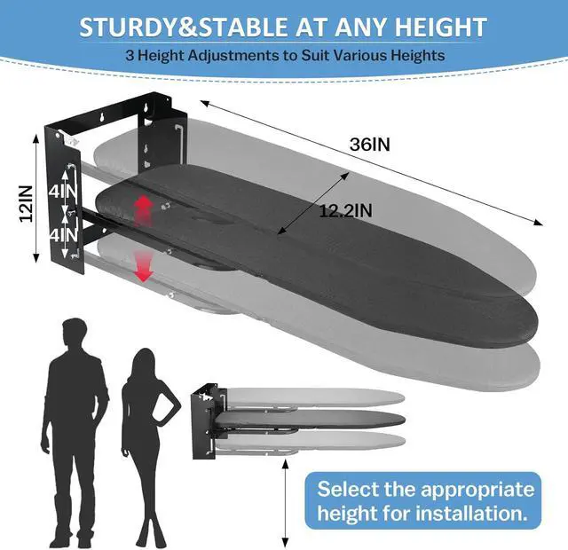 New Upgrade Height Adjustment: The wall mounted ironing board with 3 levels of height adjustment, with intervals of 4 inches, you can choose the most suitable height according to your preference.