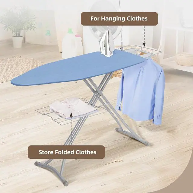 VERSATILE CLOTHING STORAGE SOLUTION: This extra wide ironing board is designed with a practical built-in storage feature that includes a generous shelf beneath the board. This shelf provides ample space for neatly arranging your folded clothes. Additionally, a convenient hanging rail is conveniently positioned next to the iron rest, allowing you to hang your garments easily