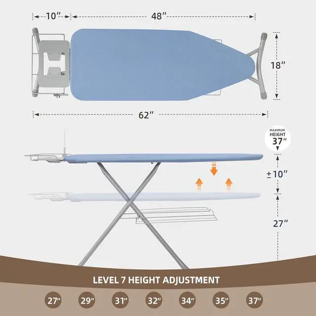 CUSTOMIZED COMFORT: Enjoy a personalized ironing experience with this foldable ironing board. It offers seven adjustable height settings, ranging from 27" to 37", allowing you to find the perfect ironing position for your needs. Each height option is equipped with a slot lock feature to ensure that the folding ironing board remains securely in place